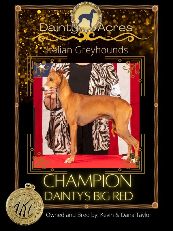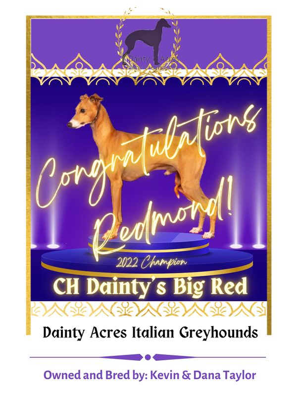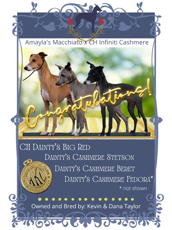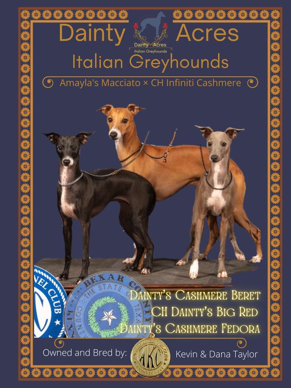 Announcing the retirement of of our first breeding pair, CH Infiniti Cashmere & Amayla's Macchiato. This proven pair passed on their incredible quality in structure, movement and brains. I am excited about the legacy that CH Dainty's Big Red and the rest of the pups from these beauties will leave in the hearts of humans and the AKC registry. I pray for God's Blessing on my fur-babies and their fur-families and I thank you for loving my babies so well. You are making a difference in this little Italian Greyhound world we live in!