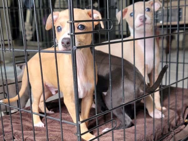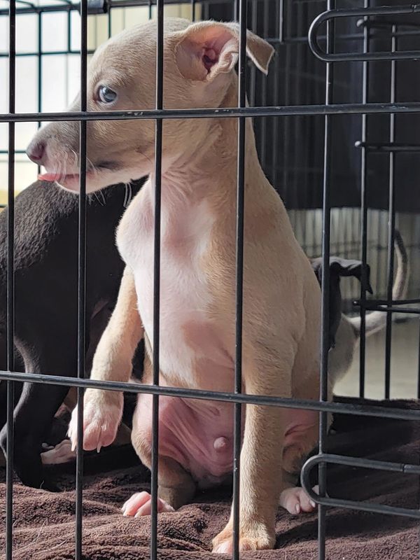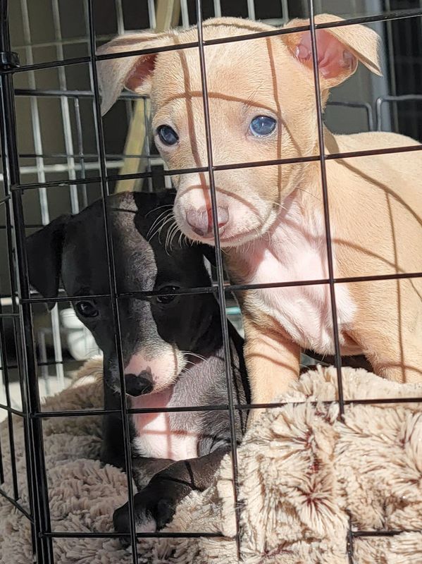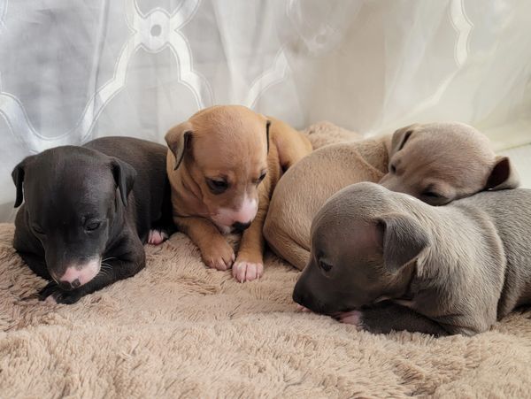 A puppy's desire for a clean bed and play area starts now. I want them to be fussy about their environment and be a prissy clean freak. I hate that smell of animal pee when I walk into a house. There are a couple things I do here in my house/kennel. Since my house is attached to the kennel, I must find sound ways to keep my kennel clean and protect my house too! Puppies always need to pee after they wake up. Puppies always need to go after eating. Puppies usually poop first thing in the morning. Puppies always pee during play time. So, knowing these facts can help me be successful with the "potty goes outside". First thing in the morning, they roll themselves out of bed and go potty on a pee pad I have taped to the floor. (Puppies are in the very curious stage, so pee pads are a blast to play with, I guess?) I have that pee pad fenced with an X-pen so I can contain them! I also use that X-pen to move to the poop, so I can pick it up outside of dancing puppy feet. I am fast, but no one is faster than a puppy and a juicy one. Puppies will sleep for hours, I have my crate and potty area set up together so they can wake up, roll out of bed and pee. Then they can climb back in that warm nest of pups to finish sleeping. You Italian Greyhound puppy will grow up to do exactly the same thing! They excel at sleeping and snuggling. They will want to do just that with you all day, that is why they are not a good dog for someone who goes to work and leaves a dog home all day. They are thin skinned, light haired, fragile, and very social. They want to be with the pack, banishing to a crate all day is punishment and rejection. Italian Greyhounds want to sleep in the bed with you. If you can’t have a dog in the bed, then they at least want to be in a crate right next to you when you sleep. The goal with all the pups, is that they will learn the "potty goes outside" command, and when I call the pups outside, I can get them to hold it until we are outside. Right now, they cannot hold it. They are going to go wherever they are, but teaching them the trigger word is real easy right now.
