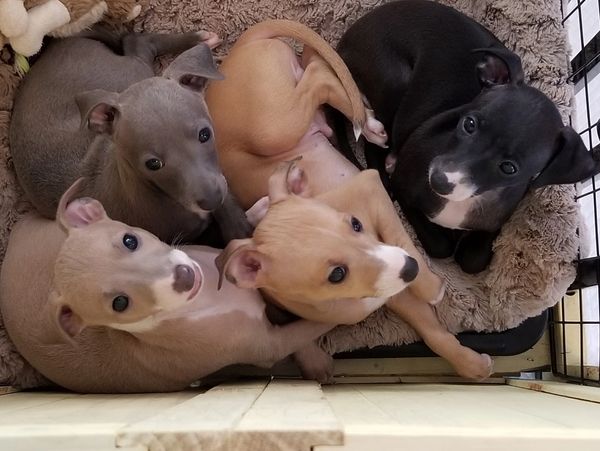 The puppies are growing so fast, which means they are eating more everyday. Monday they all weighed in at just about 3 lbs. At 3 lbs, I fed 1 oz of food per puppy every 4-6 hours with them leaving a little bit left on the plate. Today we are almost 2 oz per puppy per meal. My goal is to feed them before they are starving and always have a little extra food left on the plate. Italian Greyhounds run fast and hot, so they need fuel for their jet engines. Puppies also burn more calories when it is cold, and we have had some cold temps outside. The pups live closer to the ground than I do, and cold air sits on the floor. So even if it feels like it is warm in a room, it can be cold for the pups. I have a pet warming pad that is electric so I can regulate the floor temperature below the crate they sleep in. At least their bed is warm! I feed a couple different types of soft food and puppy chow mix. I change it up between the canned "Purina Pro Plan Classic Puppy", the refrigerated "FreshPet Puppy Formula" and a mash I make out of Chicken meat, broth, brown rice and veggies. I can add pumpkin too if needed. If I know I am going to be out of the house for more than 5 hours, I feed the Purina Pro Plan because they love it and their poops are dryer (dry **** show vs. wet **** show!). I like the Purina Pro Plan Classic Puppy because I can add purified water to it and start encouraging them to drink the sloppy diluted mash and get their water intake. I will start adding soggy puppy kibble to their daily meals to change it up and get them use to the taste. Their molars are coming in, and crunching down on hard kibble will be good for them, but the pieces are just to big for their mouths right now.