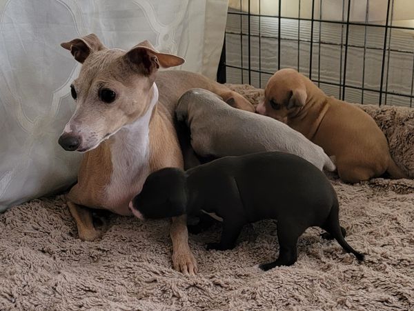 Definitely the best day yet! The responsibility as a midwife to my precious baby girl is nerve wracking, considering I hold her life and the life of all the pups in my hands. Lucy had a rough delivery, rough whelping and still navigating some girl issues. The Italian Greyhound breed is already a very co-dependent breed, but add the pain and drama of birthing, and O-M-GOSH! God is amazing how He holds me and my sweet girl up as she goes through labor hell and all the other challenges. God gives me wisdom and people to help just when I need them. And praise Jesus for the healing, her little body is doing great, producing milk, cleaning her babies and taking her business outside even in these 50 MPH winds. God bless this girl and her babies!!! Oh and God bless my husband who is so wonderful at running in and out as we need something. And our IG boys are saying, "What the heck is all the fuss about!" Wait til they find out....